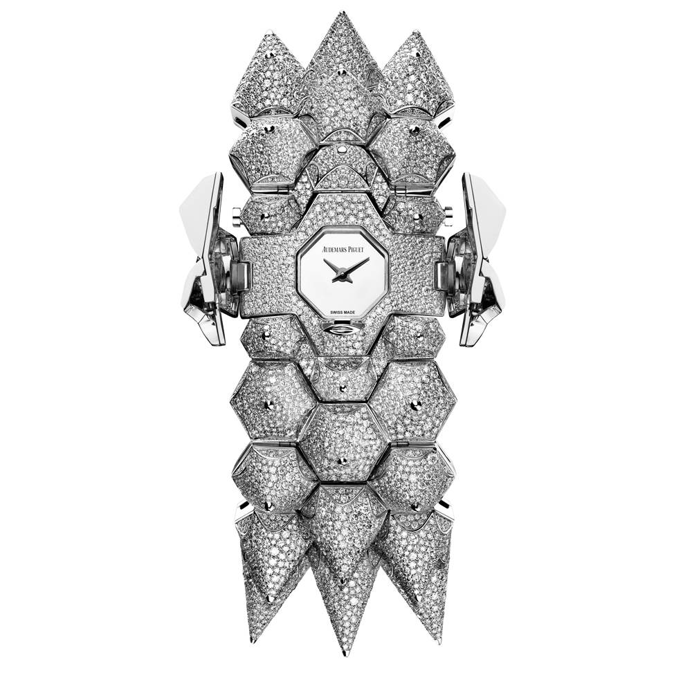 这款高级珠宝腕表的造型非常special,灵感来自瑞士汝拉山谷冬季的钟乳石。它采用18K白金材质,用了超过一万颗钻石,总重量达65.91克拉,看起来非常耀眼!