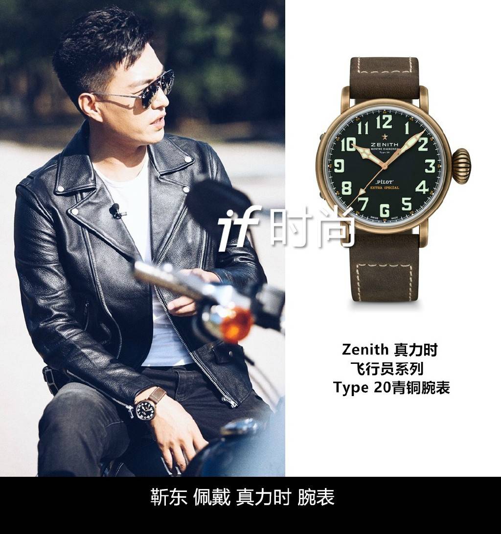 靳东之前非常宠爱一款真力时(Zenith)的飞行员系列Type 20 青铜腕表。这块表虽然价格不贵才4.8万,但是复古的外形与老干部的气质非常搭。