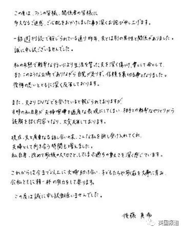 但早在3月13日,后藤真希就发布了自己的亲笔道歉信,承认自己出轨的事实。