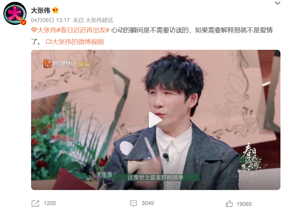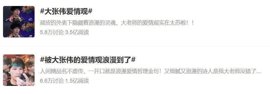 “大张伟爱情观”“被大张伟的爱情观浪漫到了”之类的话题频上热搜。