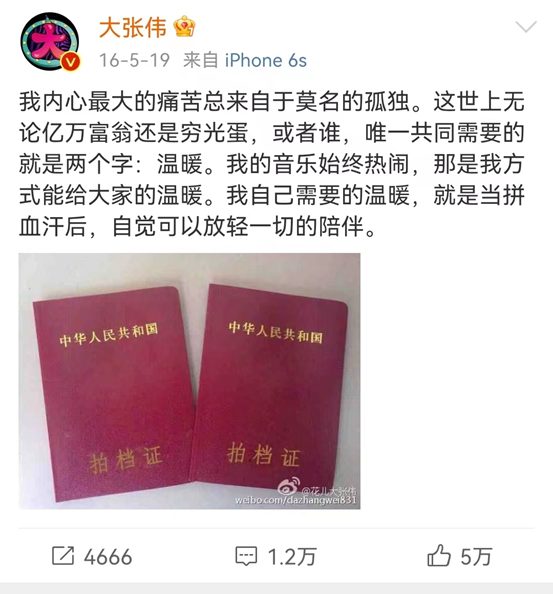 一开始,大家并不知道她的存在,直到2016年的5月,大张伟突然在微博中晒出一对“拍档证”,言语之间都在暗示他已经找到了对的人。