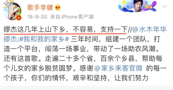 缪杰除了唱歌,这几年主要精力用在助农上,对着苹果、土地哼着怡然自得的小曲,心有少年,不争不抢,无失无得,李健还经常帮他转发助农的微博;