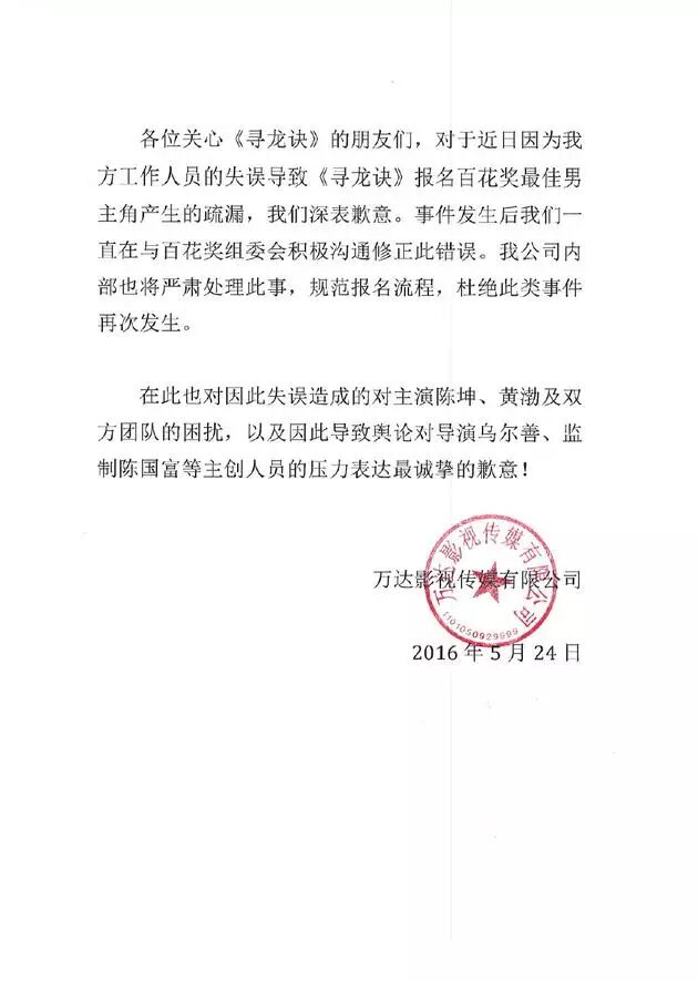 5月24日,《寻龙诀》的出品方万达影视传媒有限公司发布说明,回应称此事是“工作人员失误导致《寻龙诀》报名百花奖最佳男主角产生的严重疏漏”,并表示“一直在与百花奖组委会积极沟通修正此错误”,还保证“将严肃处理此事,规范报名流程。”最终表达了对各位主创的歉意。