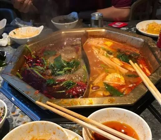 说完他的奇葩湿纸巾,回归一下美食,来看看他家的火锅到底怎么样,锅底看上去还不错,鸳鸯锅,这辣椒花椒也是杠杠的,看上去就非常的麻辣。