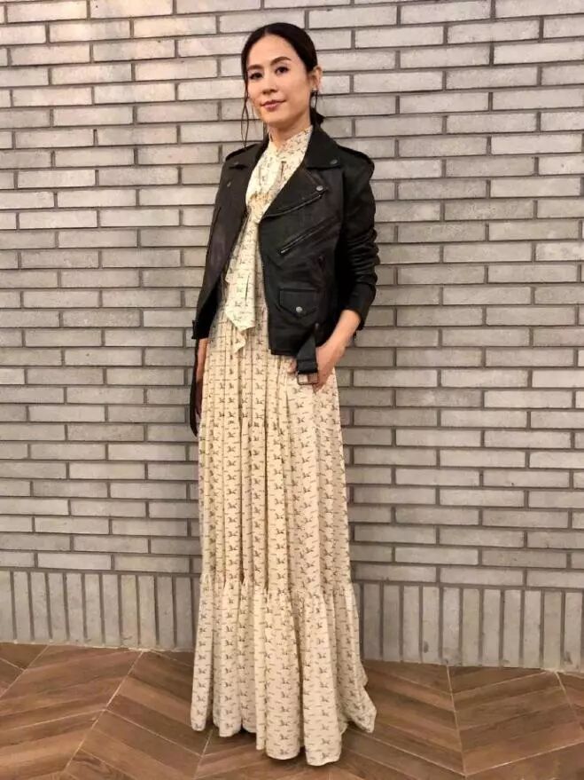 皮衣和长裙的服装搭配是许多女性都会选择的搭配方法之一。长裙优雅温柔,搭配一点略带线条感和硬朗感的皮衣,可以让你整体造型风格更为多彩。宣萱,身穿一件黑色的短款皮衣,内搭一件米白色的印花长裙,给人一种非常舒适优雅的美感。非常适合时尚女性来借鉴穿搭!