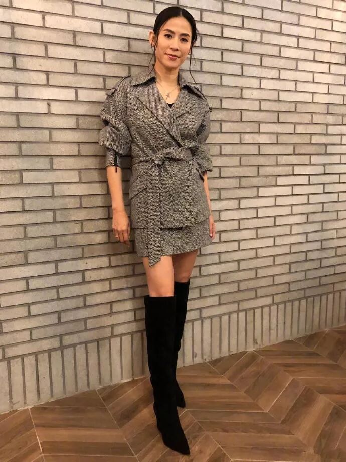 套装是一些职业女性都非常热衷选择了服装,不仅方便,而且套装还能够给人一种非常干练大气的感觉。宣萱,选择一身灰色系的印花套装,不仅达到很好的显瘦效果,还将她的身材衬托的恰到好处。如果你是双腿比较纤细,上半身略显粗壮的女性,建议可以尝试一下这样的套装,让你的身材得到更好的衬托。