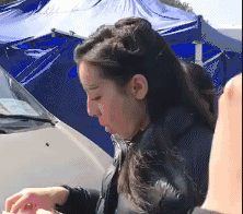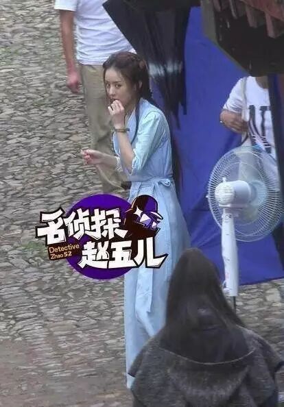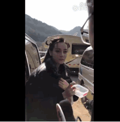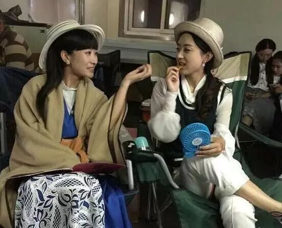 迪丽热巴看到有记者来探班,便把手里零食酸奶疙瘩分享给采访记者。