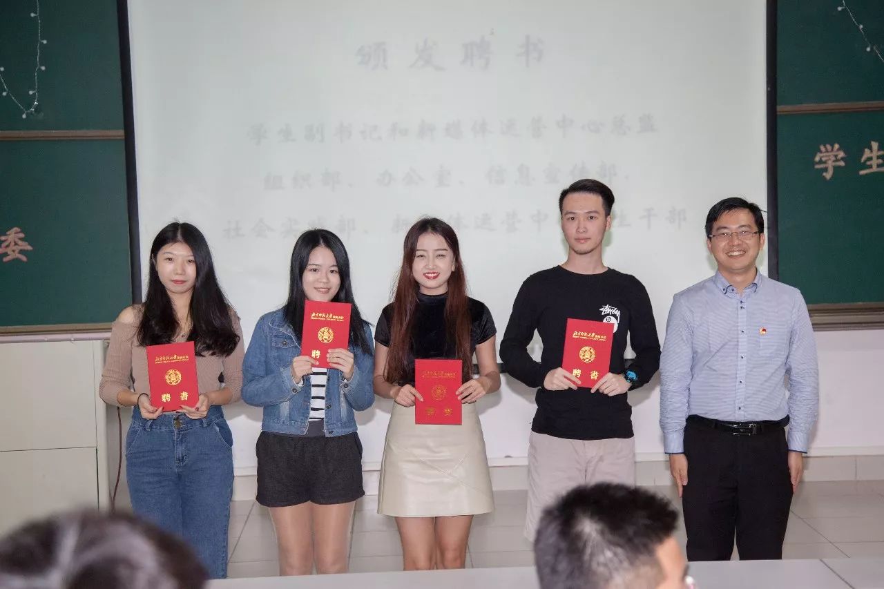 接下来,李楠老师为2016-2017学年学生副书记和新媒体运营中心总监颁发聘书,何广材老师、丁小轩老师、熊文洲老师分别为各部门学生干部颁发聘书。