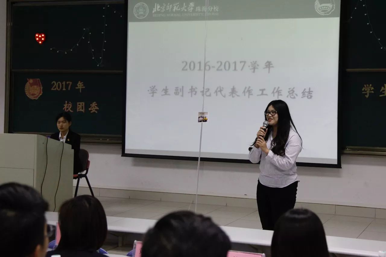 大会在嘹亮的团歌声中拉开了序幕。首先,2016-2017学年学生副书记代表马省、曾雅丽先后上台做工作总结。随后,一段视频回顾了校团委一年的成长,如视频中所言:“有生之年,欣喜相逢,时光不老,我们不散。”,“校团委永远是我们的家”。