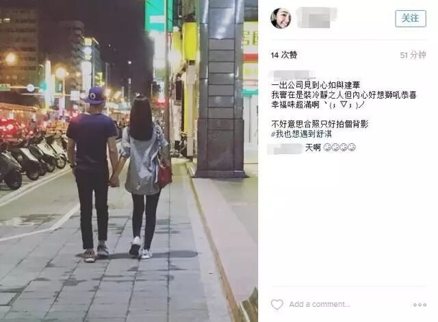 一位网友晒出一张霍建华牵着林心如在台北街头逛街的照片,这位网友写道,“一出公司见到心如与建华,我实在是装冷静之人但内心好想狮吼恭喜,幸福味超满啊ヽ(;▽;)ノ不好意思合照只好拍个背影”。(这位网友还顺便说,还想遇到舒淇……贪心是你贪心)