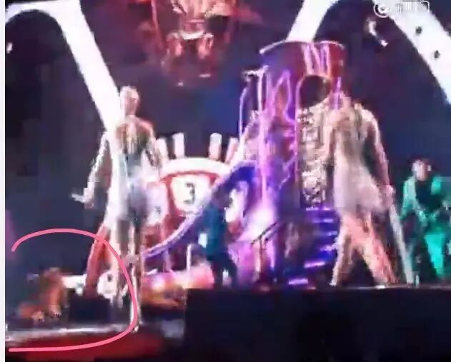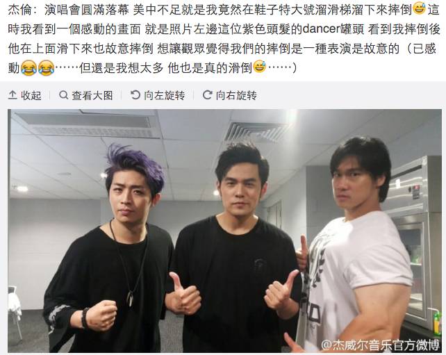 周杰伦在踩着大型滑梯滑下来时,没踏稳不慎摔倒,没想到这时一旁的舞者竟马上跟着跌倒,顿时让周董的摔倒变成表演的一环,让他相当感动。