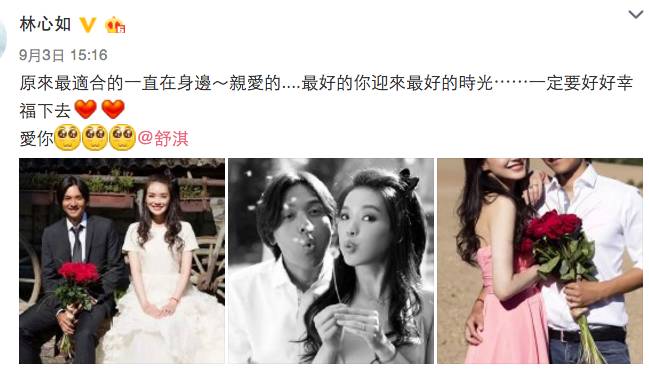上周六舒淇公开婚讯后,好友林心如也是第一时间发送了祝福: