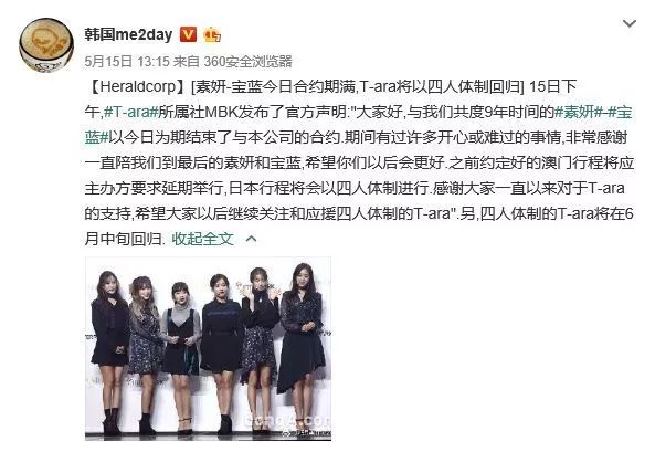 5月15日,成员朴素妍和全宝蓝合约到期,T-ara则于6月以李居丽、咸恩静、朴孝敏、朴智妍四人体制回归。