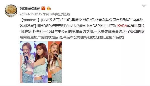 但,2016年1月15日,成员朴奎利、韩胜妍、具荷拉与公司的合约结束,三人均不再续约,公司正式宣布KARA组合解散。