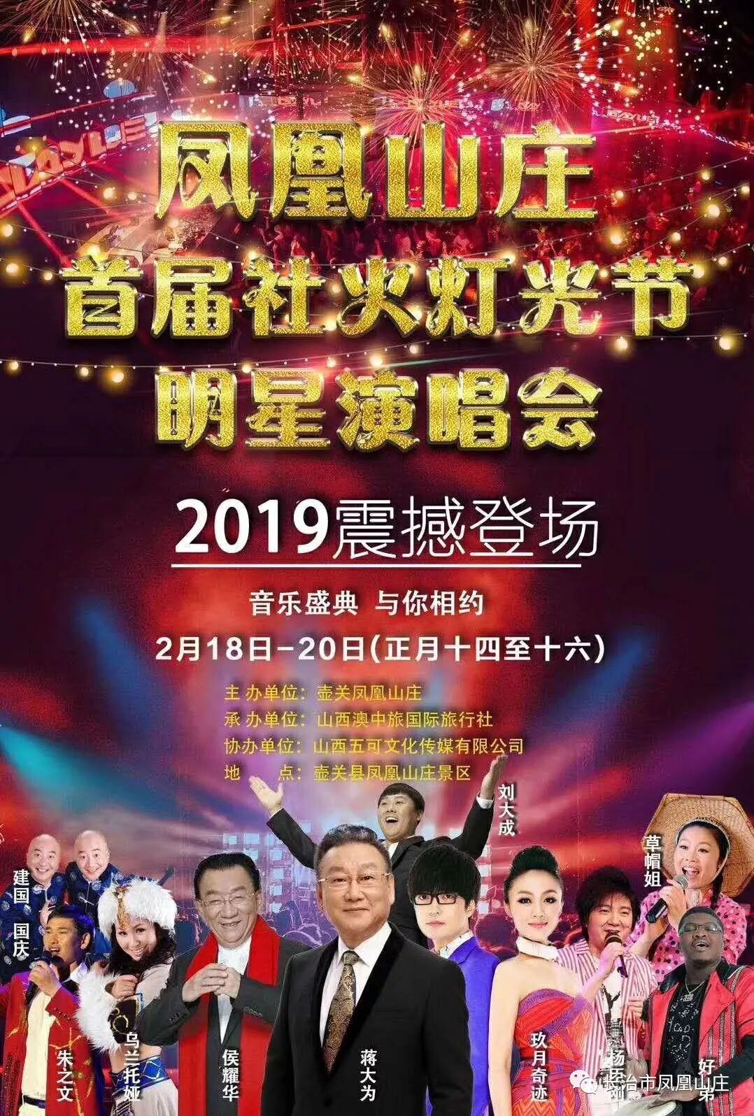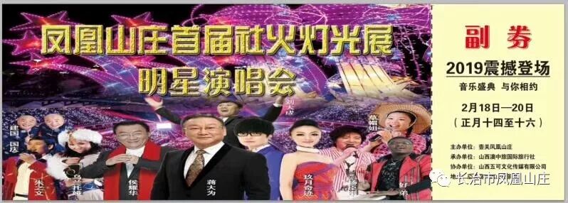 在2019年的元宵节,凤凰山庄诚邀各界明星共贺元宵佳节。来巡演的明星有侯耀华,星光大道2011年度月冠军好弟,2010年星光大道年度总冠军刘大成,著名演员建国国庆双胞胎兄弟,曾参演过《小鱼儿与花无缺》《妈祖》,在剧中分别饰演巫手巫脚,嘉应嘉佑。还有大家最熟悉的《老鼠爱大米》的演唱着杨臣刚等多位重量级。
