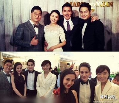 公开的照片中,金范与代表中国的明星和电影界人士一同参加结婚典礼。当天除了高圆圆和赵又廷两位主人公,还有Angelababy、王珞丹,以及业界有关人士。金范与他们谈笑风生,并留下了超越国境的友情认证照。