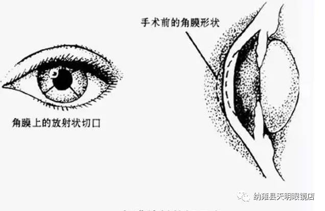1953年日本的佐藤教授首先提出在角膜面做放射状切口,改变角膜弯曲程度以矫正近视。由于很多病例的角膜内皮受到严重损伤,其教训居多。20多年后,经改良只在角膜前表面切开,这种手术在前苏联及美国广泛开展,也一度风靡我国,但由于其对手术操作技巧、切口深度、长度选择等要求很高,术中风险较大且效果不稳定等因素,逐渐淡出视光矫治舞台,当然目前仍有人开展此类手术。