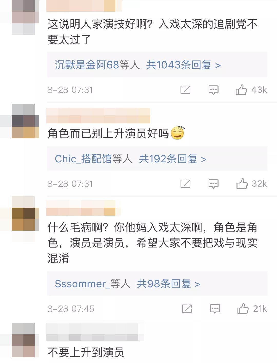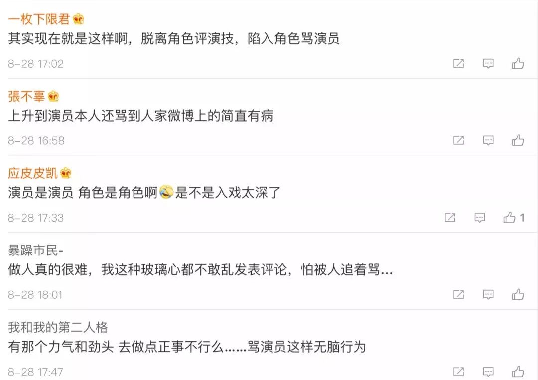 幸好还是有很多支持王茂蕾的理智网友,纷纷表示“角色而已,别上升到演员”“这说明人家演技好,不要入戏太深”“要分清现实和电视剧呀”。