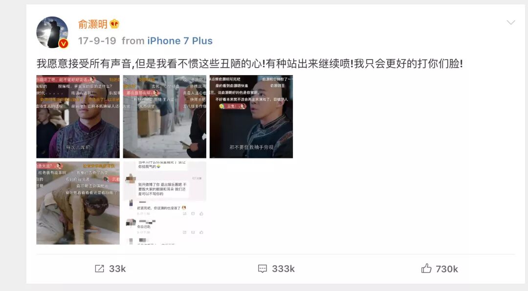 对于俞灏明来说,本来演技得到回馈是一件好事,毕竟自己的努力得到肯定,但是殊不知却引来一些失智粉的恶意伤害。最后他终于忍无可忍,发了一条微博称“愿意接受所有的声音,但是看不惯这些丑陋的心”。