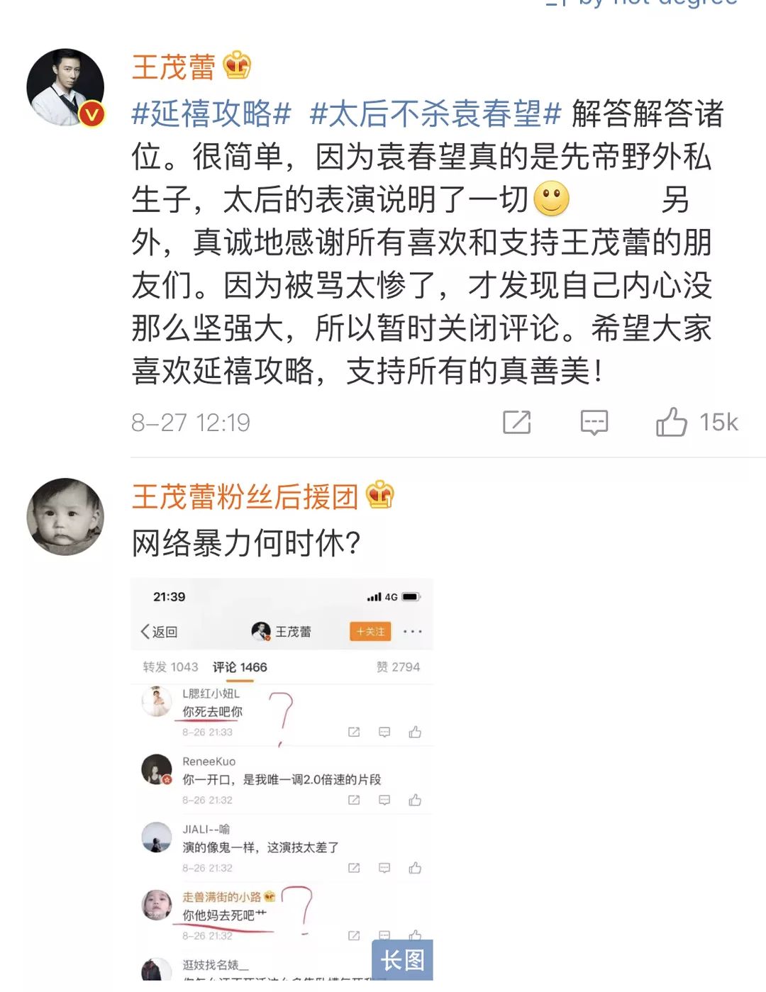 王茂蕾的微博也因此暂时关闭了微博评论,因为自己被骂得太惨了,自己的内心没那么强大。