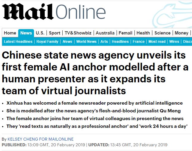 ▲Chinese state news agency unveils its first female AI anchor modelled after a human presenter as it expands its team of virtual journalists (via Daily Mail)