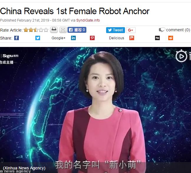 ▲China’s Xinhua unveils artificial intelligence-powered female news anchor (via Hindustan Times)