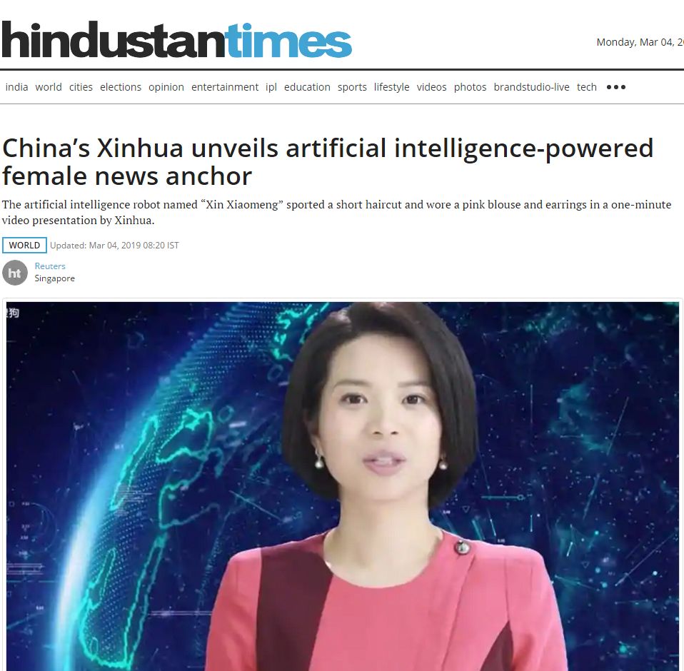 ▲中国新华社解开了人工智能女主播的面纱 (via Hindustan Times)
