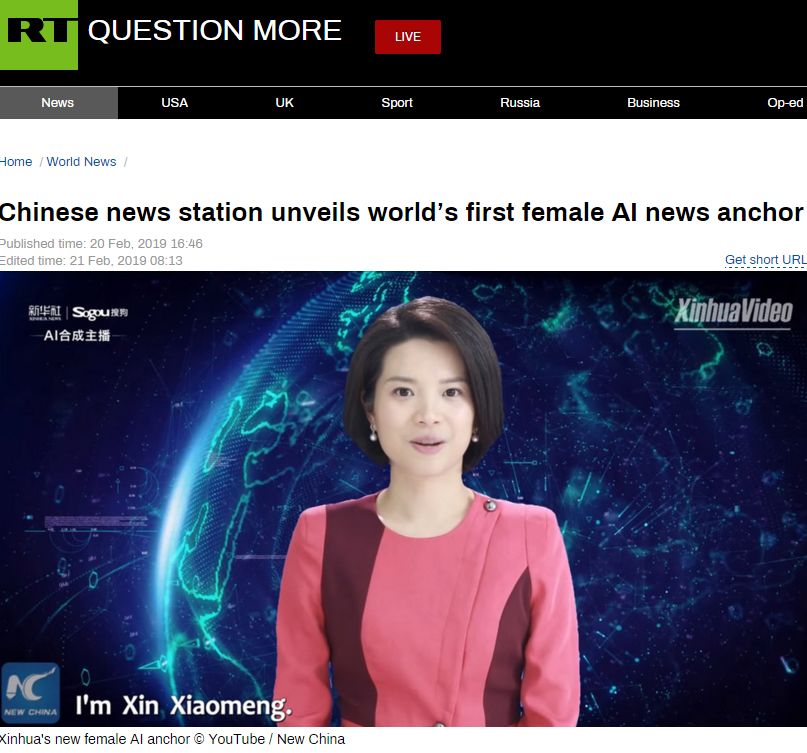 ▲Chinese news station unveils world’s first female AI news anchor (via Russia Today)