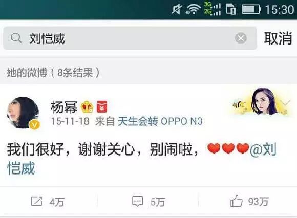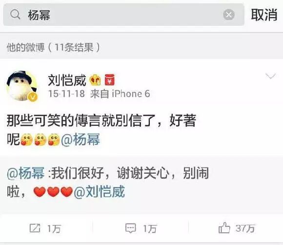 而两人的互动更是少得可怜,15年,也就是两人新婚不久,应该还是如胶似漆的时候。在杨幂的主页上搜索刘恺威,相关的微博,主要就是生日祝福,帮老公刘恺威和闺蜜唐嫣宣传新戏…