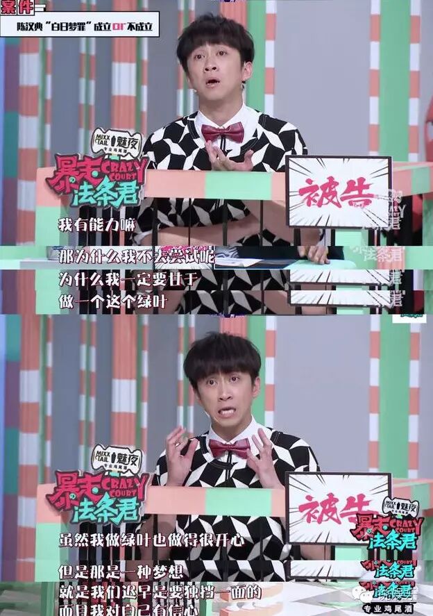 事情是这么发生的,这期节目陈汉典作为嘉宾,被大家吐槽他爱做白日梦,总是想着要当主角,委屈的陈汉典就表示,自己有能力、有梦想、有信心,凭什么要一直当绿叶,为什么不能去尝试?