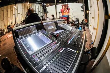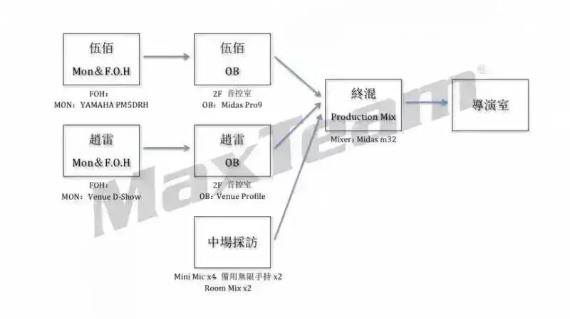 这张是这次audio流向图,现场分布了二个乐队的表演区,艺人及乐队各自拥有独立的monitor控台,也设立了各自的OB间负责终端输出。加之直播中歌手间换场转换的过程里又切入了另一现场的歌手交流环节,在直播中为了避免二个现场声音上的过多差异, 保证节目整体声音输出的统一性和流畅性,所以全部音源汇总到“终混”这个最终端,作出整体平衡和修饰后,直接输出至导播间,来呈现最完美的直播音质。