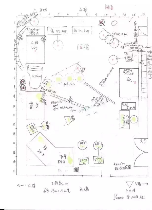经过无数次的探讨与修改,街声的制作统筹许经纶(怪兽)自己手绘的现场分布图,在有限空间里,二个乐队的乐器、音响系统分别独立使用,让他伤透了脑筋。