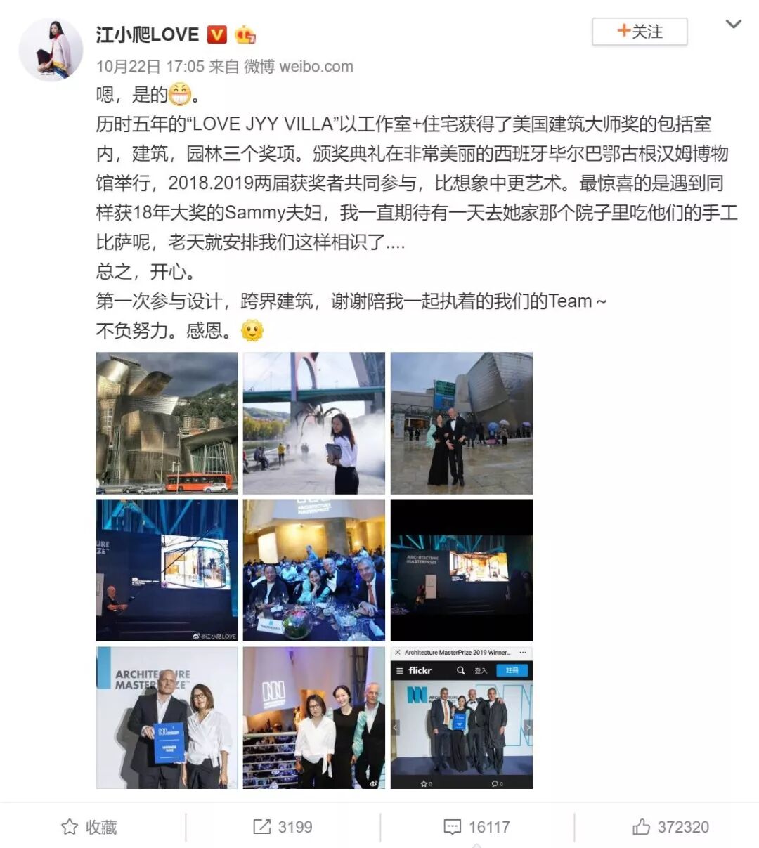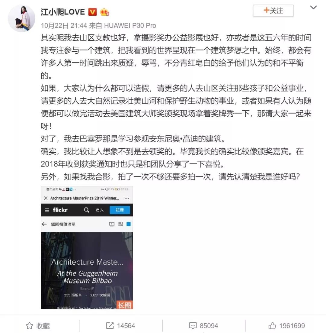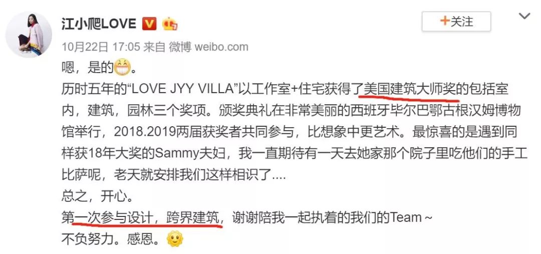 事情的起源于10月21日,微博上突然出现了#江一燕获建筑大奖#的话题。