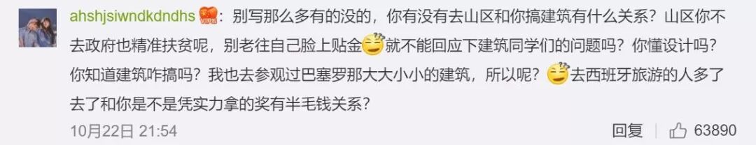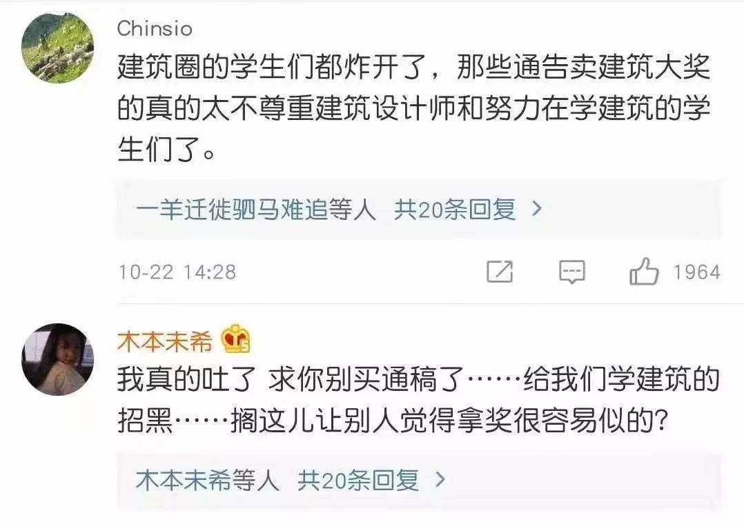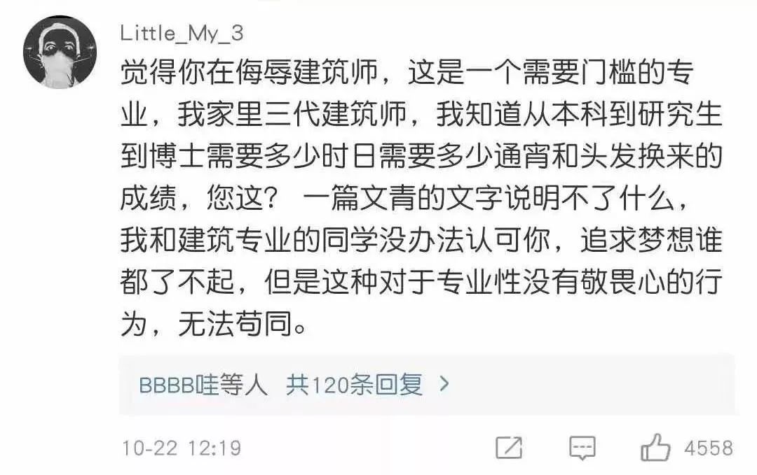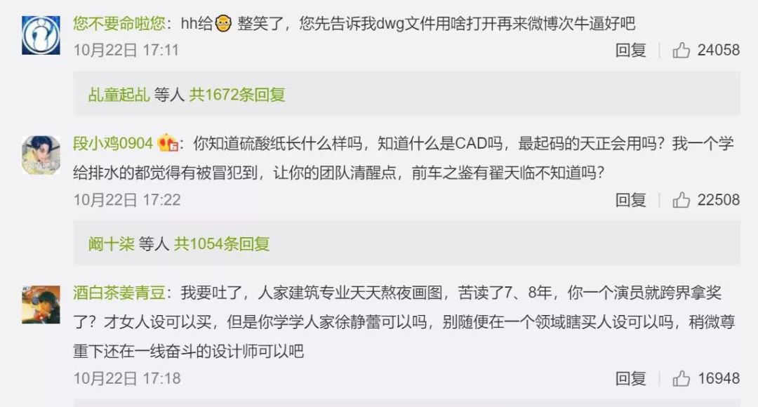 “我要吐了,人家建筑专业天天熬夜画图,苦读了7、8年,你一个演员就跨界拿奖了……别随便在一个领域瞎卖人设可以吗,稍微尊重下还在一线奋斗的设计师可以吧!”