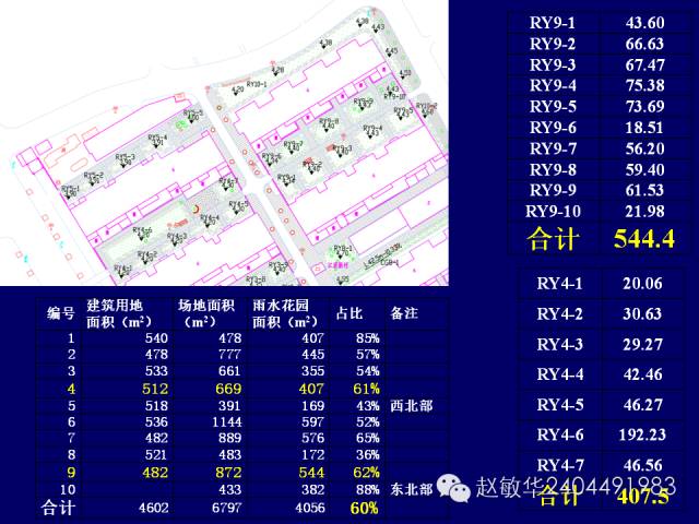 右边9系列编号RY9-1到9-10的10个雨水花园,面积加起来是544平方米。编号RY4-1到4-7的7个雨水花园,面积加起来是400多平方;均占了场地面积的60%多,就是两栋房子当中60%多的面积(4056平方,占小区总面积19000平方米的22%),挖成一个一个的坑。