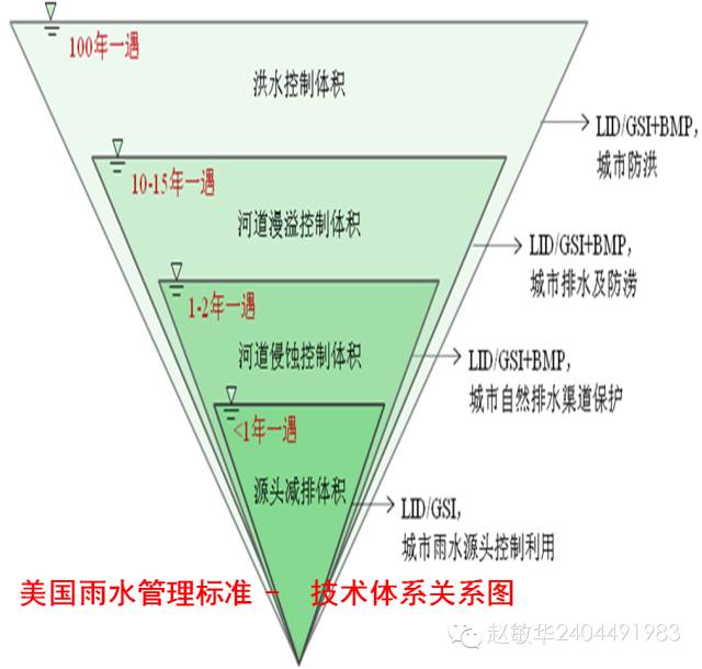 这是美国的雨水管理标准体系,源头减排一年一遇,洪水是50年、100年一遇,是一个配套体系。
