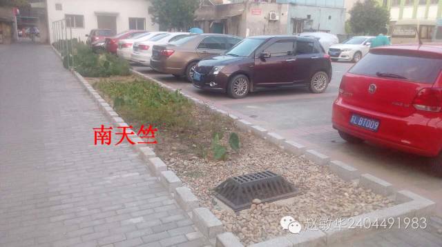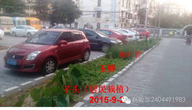2015年9月2日,我又去了现场看雨水花园植物生长情况。停车场太阳一晒很热,南天竺因为是喜阴的植物,太阳一照就晒死了,土露出来居民就把芋头种上去,芋头长得还不错。
