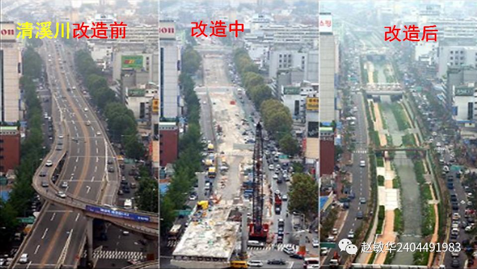 用韩国清溪川案例,来说明我对清水绿岸-鱼翔浅底的理解。2003年,清溪川是高架路。