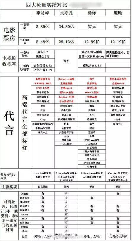 鹿晗的影视剧资源和高奢代言仍旧是最虐的,回国三年只拿到了《择天记》一个IP,电影至今没有一个一番,四大流量之中也只有他没有高奢代言。