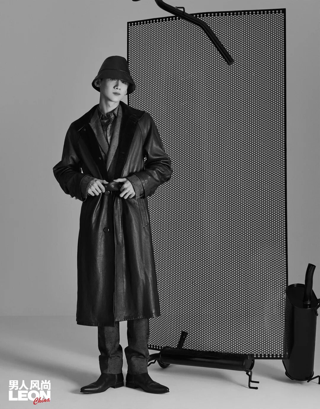深灰色大理石纹衬衫、深灰色西服、深灰色西裤 /均为 BERLUTI,黑色翻领长款皮大衣 / SalvatoreFerragamo,黑色高筒尖头皮鞋 / GIVENCHY,皮帽 / JIL SANDER