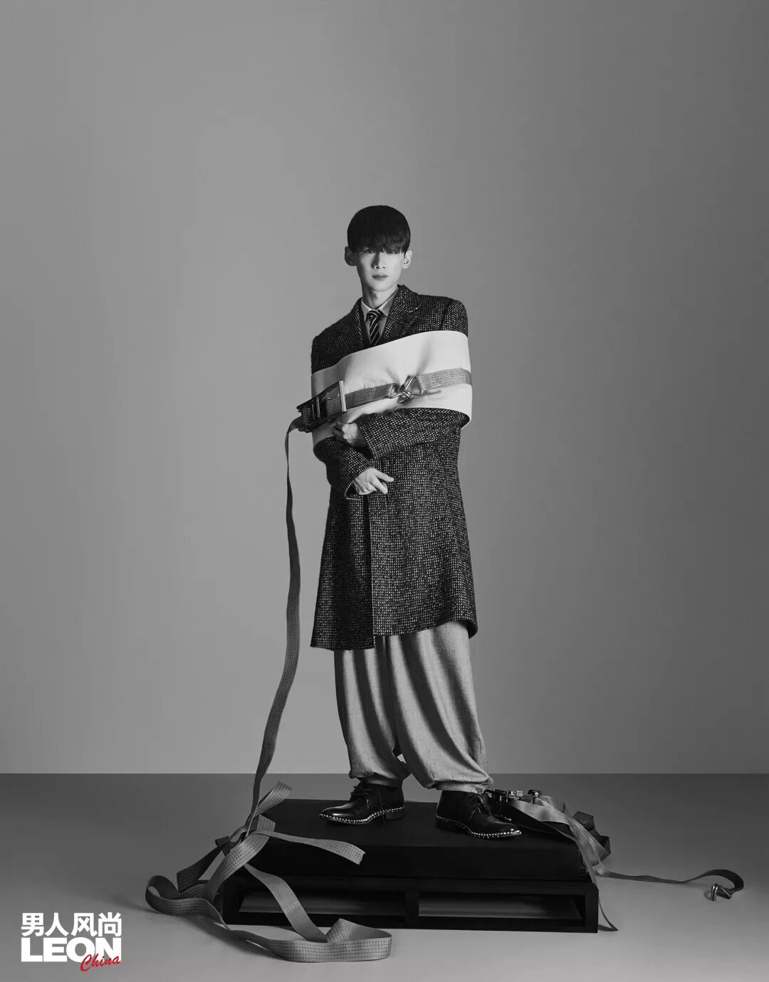 刚刚结束了一组平面拍摄,白敬亭脸上汗津津的,他脱下品牌方送来的冬装外套,只穿了一件白色背心,休息室的沙发背前立着一个黑色的腰垫,他靠在上面。当被问到连续拍摄七小时是否觉得辛苦时,他不以为然地摇摇头:“时间上不算是高强度。”问及腰垫才得知,原来他的腰背拉伤了很久。