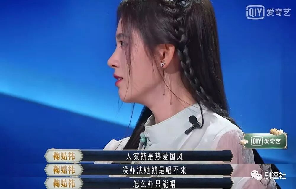 这时,鞠婧祎又插嘴,“人家就是热爱国风,没办法她就是唱不来(怎么办)?”