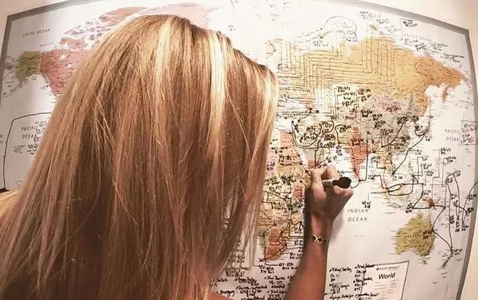 她第一时间就跑到商店买了张大大的世界地图,回家后贴在自己的房间,每天开始不停地在地图上描描写写,认真规划自己这场旅行的路线。