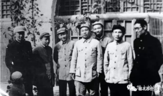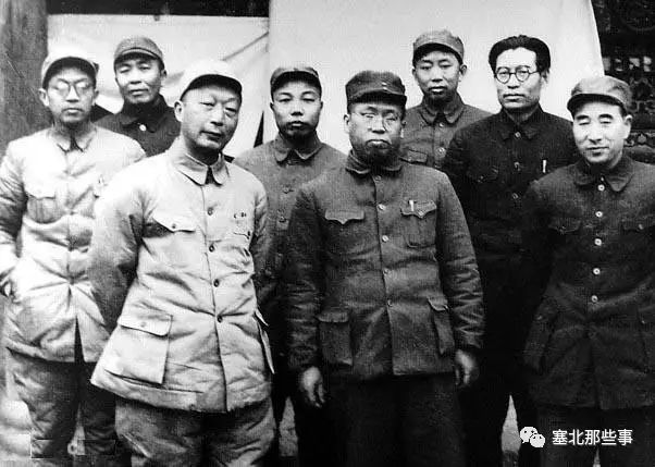 平津战役总前委指挥部合影,左起:黄克诚、谭政、聂荣臻、萧华、罗荣桓、刘亚楼、高岗、林彪