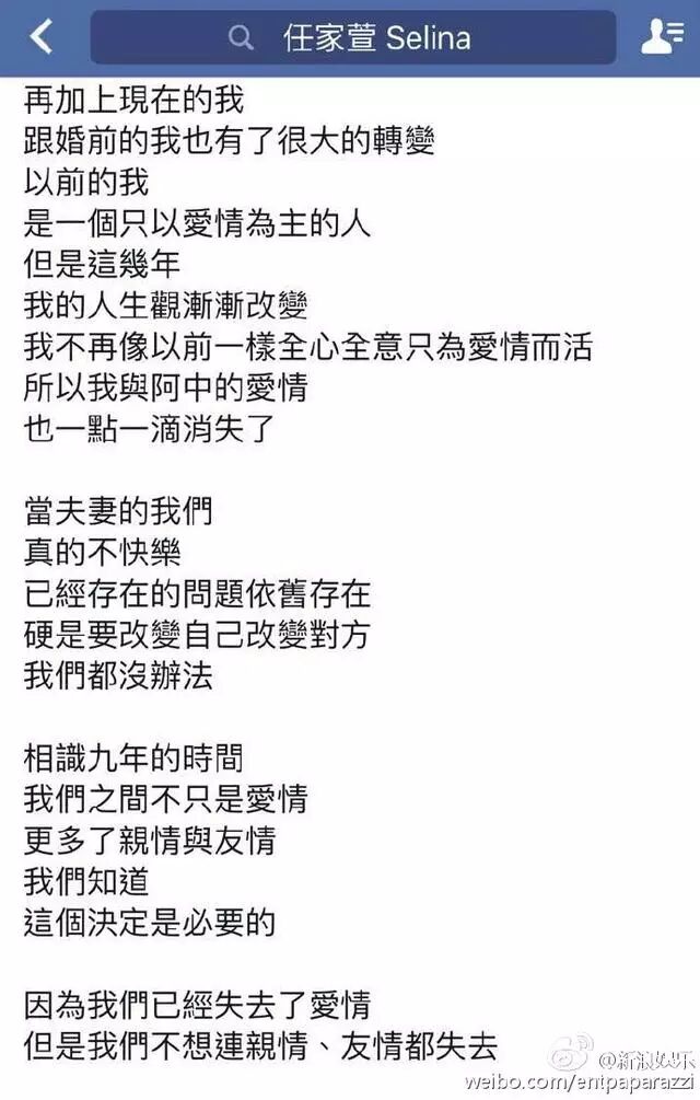 任家萱在声明中写道:“我没有扮演好一个贤妻的角色”、“再加上现在的我 跟婚前的我也有了很大的转变 以前的我 是一个只以爱情为主的人 但是这几年 我的人生观渐渐改变 我不再像以前一样全心全意只为爱情而活 所以我与阿中的爱情 也一点一滴消失了”⋯⋯
