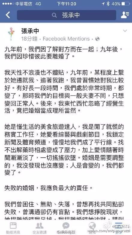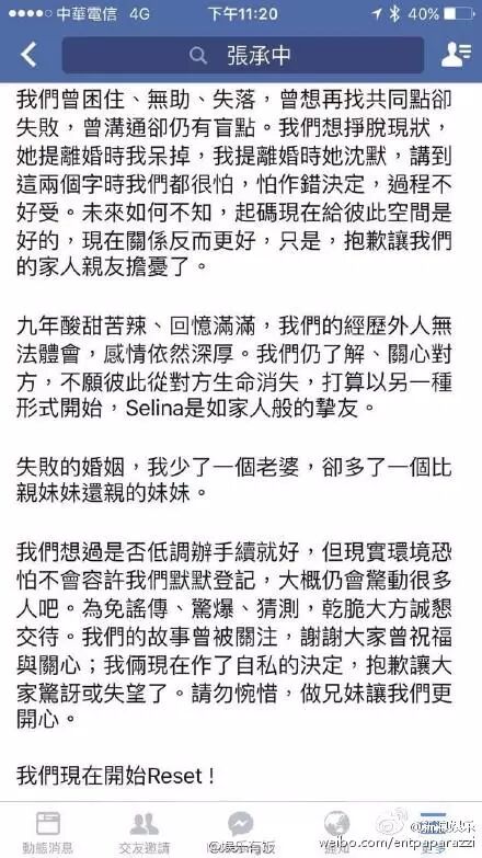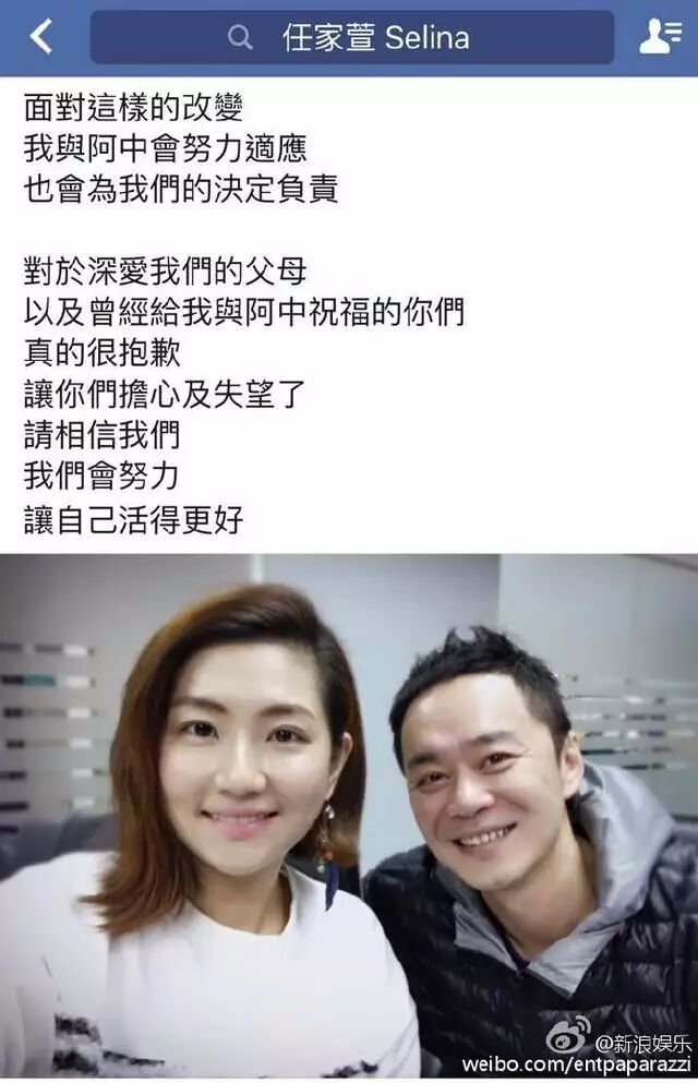 Selina与张承中决定离婚,在脸书页面的活动似乎也透露两人早已各自活动的讯息,从2015圣诞节、跨年、农历年的相关文章与照片中,Selina不是跟好姐妹在一起,就是与家人的国外出游。而好姐妹Selina、Hebe疑似早就知情,才会在脸书晒恩爱,试图逗笑Selina。