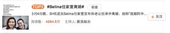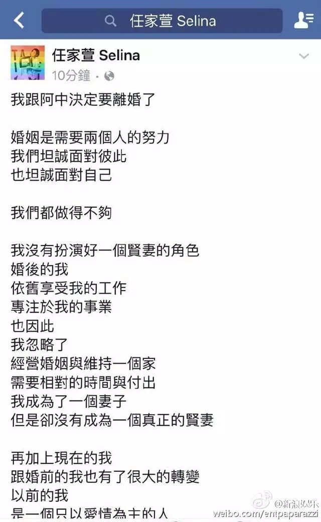 台湾女子组合“SHE”成员Selina任家萱深夜宣布离婚!