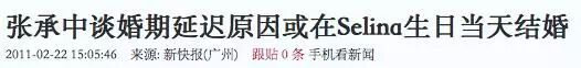 2011年2月21日,张承中宣布和Selina的婚期将无限期延后,他还强调自己迫不及待想娶Selina过门,延婚只是不希望给Selina过大压力,让她可以安心复健。