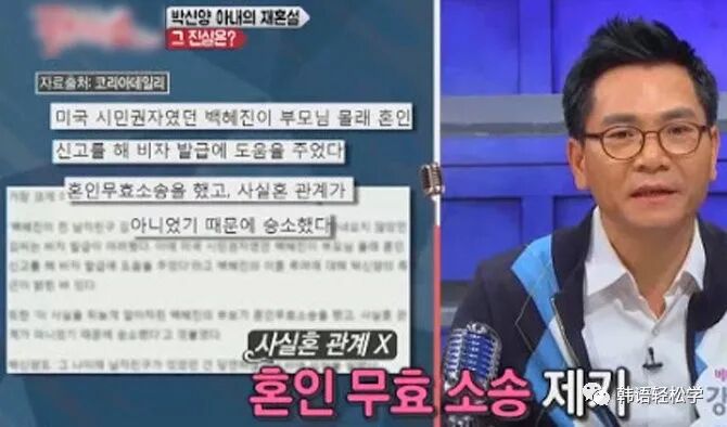 据朴信阳介绍,K某是白慧珍高中时期的男朋友。"去美国留学的K某因没有服兵役,签证发放遇到困难,因此,拥有美国市民权的白慧珍在父母不知情的情况下登记结婚,并提供了帮助。