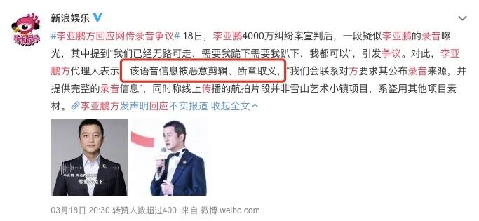 对此,李亚鹏方已经出来回应了:录音为断章取义、恶意剪辑。